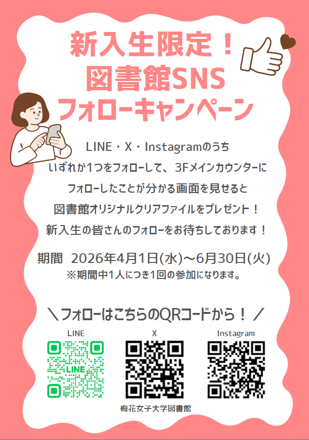 図書館が運営するLINE・X・Instagramのいずれか1つをフォローして、